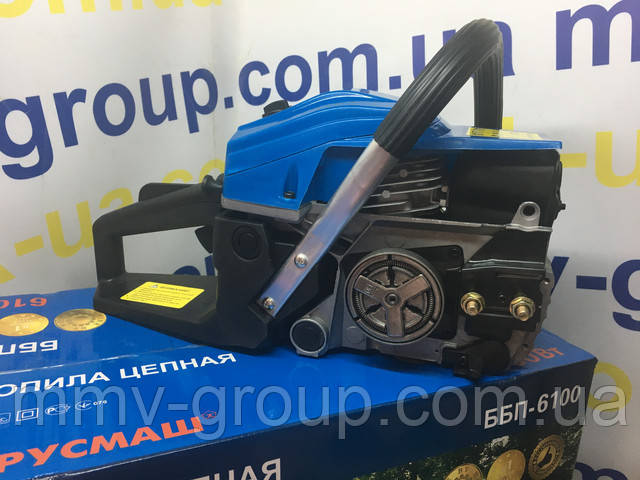 Комплектація: Бензопила Білоруш ББП-6100, шина — 1 шт., ланцюг — 1 шт., набір ключів, посібник користувача, місткість для змішування палива та оливи, лійка.